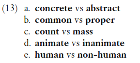 Selectional restrictions, as hinted above, lead us to employ large subclasses of nouns that are familiar from traditional grammar. The subclasses are set out in 13.