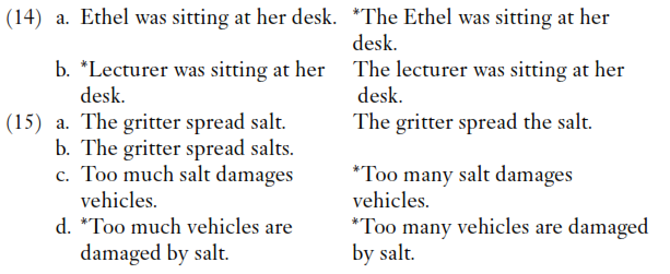 These subclasses were established in traditional grammar not just for the analysis of English but for the analysis of all the languages of Europe. They have been extended to the analysis of languages all over the world – many languages outside Europe have particularly intricate sets of distinctions. We have brought in these subclasses in connection with selectional restrictions, which are closely connected with semantics. A very important point, however, is that the distinctions set out in (13) are relevant to the grammar of many languages. We are not suggesting that all the distinctions are relevant to the grammar of every language, but any sample of languages from different language families and different areas of the world will show that each distinction affects the grammar of some languages. For example, English proper nouns such as Ethel typically exclude the and a, as discussed in Chapter 1 using the examples reproduced below as (14). Common nouns, which are not the names of people, towns and so on, typically allow or require the or a, for example lecturer in (14b), gritter and salt in (15a).