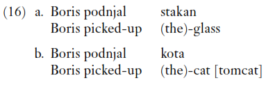 Stakan in (16a) is inanimate and has no case suffix. Kot is animate and takes the case suffix -a. Other patterns in the Russian case system involve the distinction between concrete and abstract and between count and mass, but we omit the details.