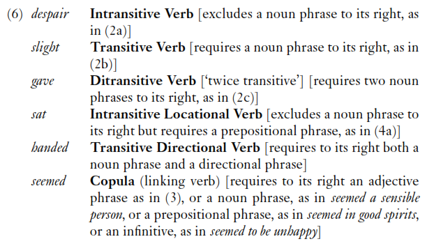 Some of these classes of verbs have traditional labels as listed in (6). These labels are convenient for talking about classes of verbs rather than individual verbs.