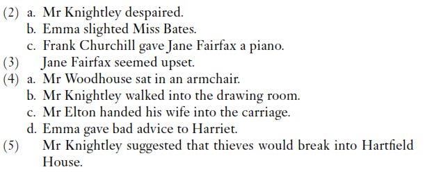 Handed in (4c) requires a noun phrase to its right, here his wife, and a prepositional phrase describing a direction, here into the carriage. Gave in (4d) allows the same types of complement as handed; ‘allows’ and not ‘requires’ because gave also occurs with two noun phrases as in (2c). Note that not all verbs of giving or assigning behave like give. Attribute requires the structure in (4d) but not the structure in (2c) – Everyone attributed good intentions to Frank Churchill vs *Everyone attributed Frank Churchill good intentions. Finally, suggested in (5) is a verb that allows an ordinary noun phrase to its right, as in Mr Knightley suggested this plan, but it also allows a complement clause, here that thieves would break into Hartfield House.